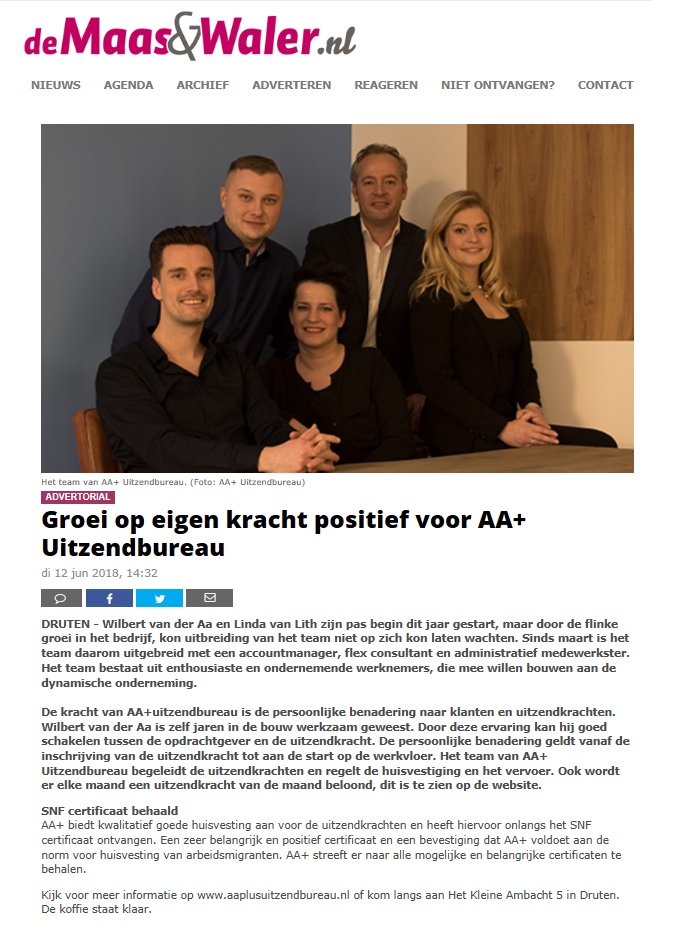 Uncategorized Groei op eigenkracht positief voor AA+ Uitzendbureau 19/07/2018 by Kelly Hendriks 0 comments https://www.demaasenwaler.nl/nieuws/algemeen/25152/groei-op-eigen-kracht-positief-voor-aa-uitzendbureau-advertorial- Share: Deel op: 0